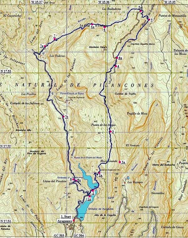 • The path between Risco Caido, GPS waypoint 5a and the barranco floor GPS waypoint 6 has become overgrown and slightly eroded and must be walked with great care. I have notified the Artenara council of this difficulty.