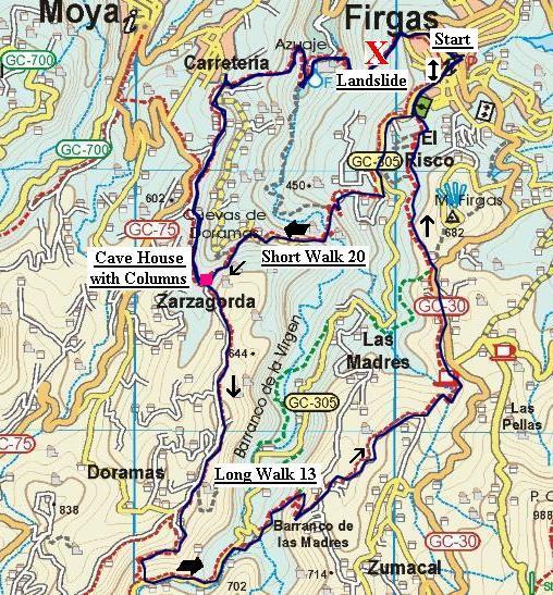 It is still possible to do a long Firgas circle using my guides, if you have purchased both guides. My recommendation would be to do the short Firgas circle in reverse from the end to GPS waypoint 5, approx 1 hour 40 minutes, then turn left at the cave house with columns to continue with the long Firgas circle from the approx GPS waypoint N 28.05.570 W 15.34.730 to the end, approx 3 hours, making a total walk of approx 4 hours 40 minutes.